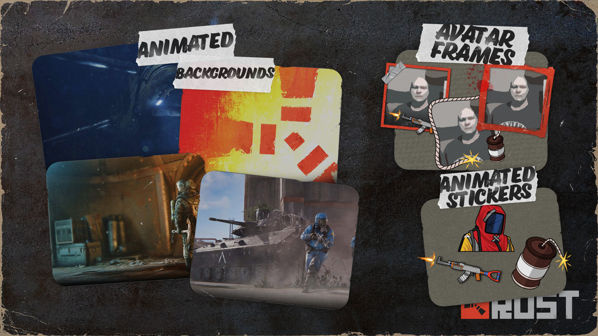 Добавив новые анимированные рамки для аватаров, анимированные стикеры и анимированные фоны для профиля, вы получите больше возможностей продемонстрировать свою любовь к Rust в своём профиле.