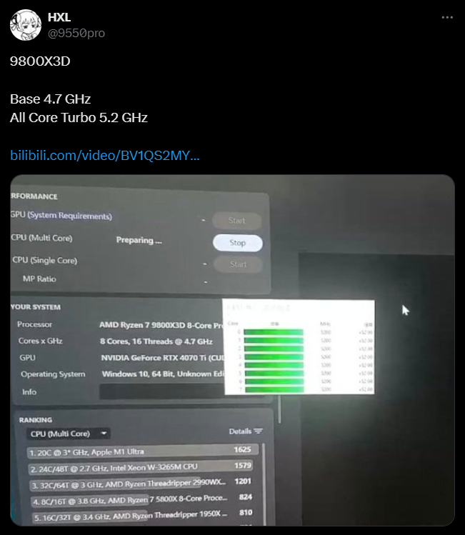 Согласно данным из программы Cinebench R23, базовая частота 8-ядерного 9800X3D составляет 4,7 ГГц. Утечка также утверждает, что во время рендеринга процессор может поддерживать частоту 5,2 ГГц по всем ядрам. К сожалению, нет никаких доказательств того, что процессор тестировался в реальном времени, поскольку в видео показаны только скриншоты. Кроме того, утечка не предоставила изображения самого процессора. Насколько нам известно, это может быть подделка или неполная версия процессора, которая уже должна быть доступна.