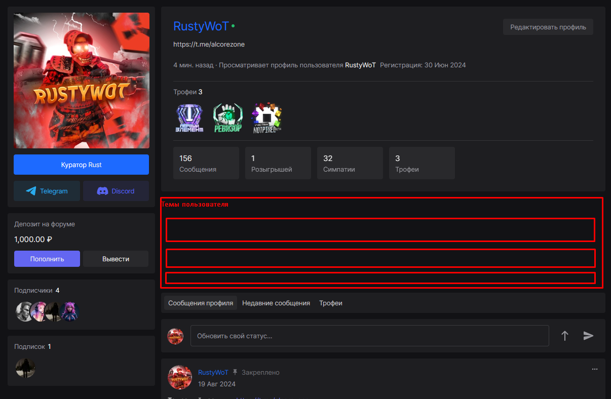 Пользователь сам может выбрать какие темы будут отображаться в его профиле , если же пользователь не сделает выбор тем, то сделать отображение последних тем