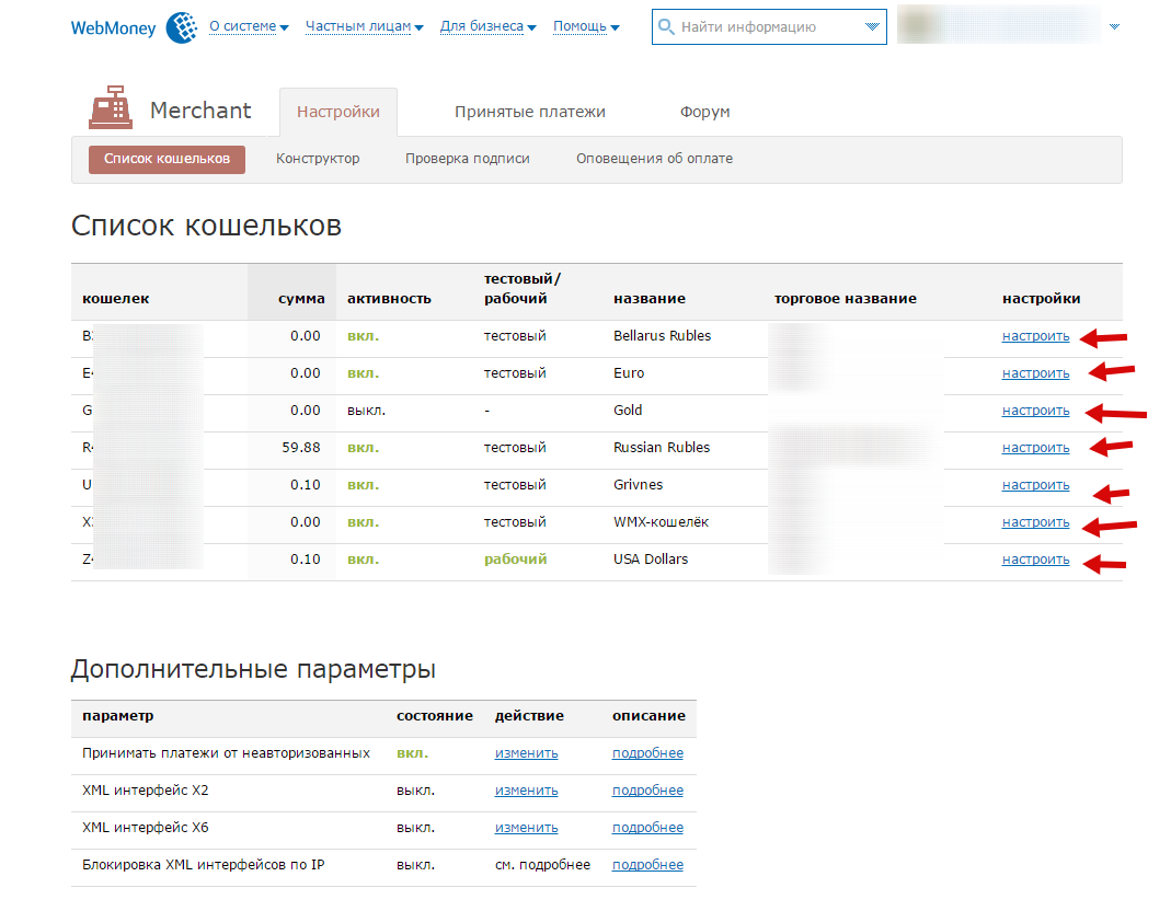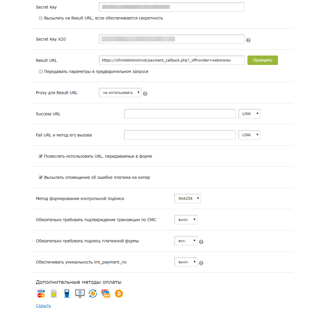 Укажите в настройках данные, которые вы получили на странице своего кошелька.