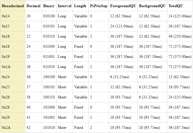 Часть, которую он выбирает для чтения, - это первые 6 бит битовой маски, что означает, что значения больше 63 являются повторяющимися. В таблице ниже приведены все возможные значения (совместимые между клиентской и серверной редакциями Windows, так как 00 или 11 не используются в AABB или AABBCC в битовой маске, которые имеют разные значения на клиенте и сервере). Время в миллисекундах основано на частоте тактовых прерываний современных мультипроцессоров x86/x64.