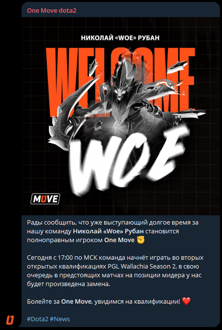 Киберспортивная организация One Move объявила о присоединении Николая 'WoE' Рубана к составу команды. Анонс игрока был опубликована в официальном telegram-канале клуба.