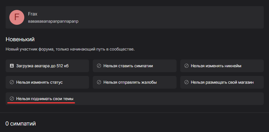 Пользователи с группой "Новенький" не могут поднимать свои темы, подробнее можно ознакомиться по ссылке - Для просмотра ссылки зарегестрируйтесь или войдите на форум