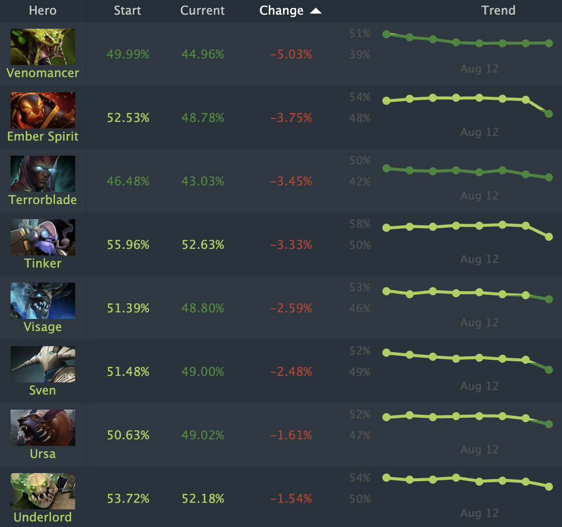 После обновления 7.37b винрейт Venomancer в Dota 2 упал с 50% до 45%. Ember Spirit и Terrorblade также пострадали, их винрейт снизился на 3.75% и 3.45% соответственно.