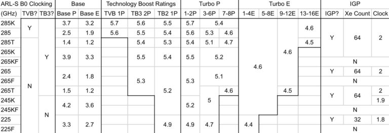 Флагманский SKU, Core Ultra 9 285K, как сообщается, имеет 8 ядер Lion Cove (Performance) и 16 ядер Skymont (Efficient). Это самая высокая конфигурация в линейке, которая, как утверждается, также может быть разогнана до 5,7 ГГц с помощью технологии Thermal Velocity Boost, о чем сообщалось ранее. Данные характеристики относятся к варианту с TDP 125 Вт, но также будут доступны конфигурации с TDP 65 Вт (285 non-K) и даже 35 Вт (285T). Базовая частота этих SKU будет значительно ниже: 2,5 ГГц и 1,4 ГГц, соответственно, по сравнению с 3,7 ГГц P-Core на базе 285K.