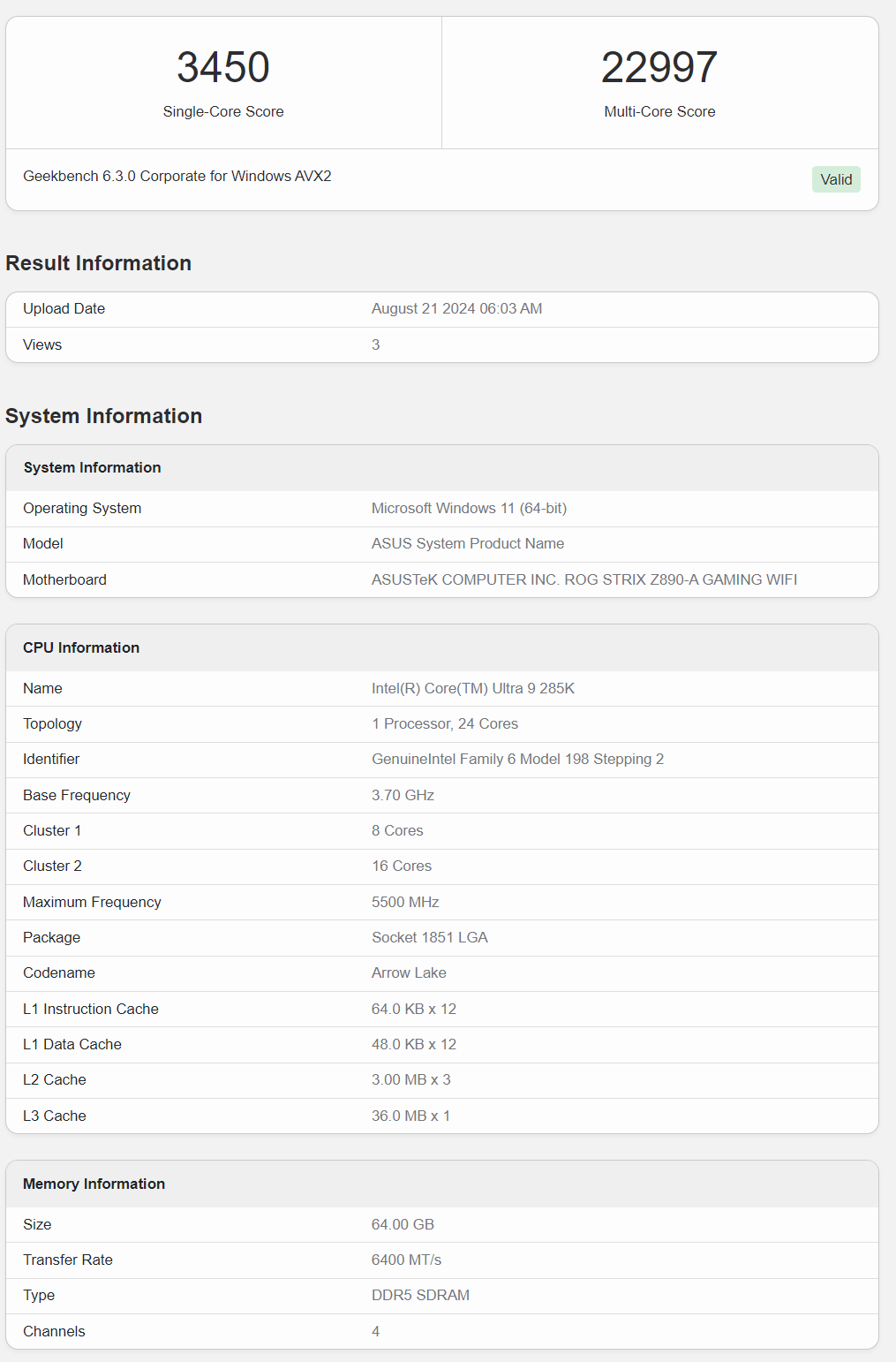 Недавно процессор был протестирован в Geekbench, и теперь доступны два разных результата. В одноядерном тесте процессор набрал 3449-3450 баллов, а в многоядерном - 22997-23024. Процессор был протестирован на материнской плате ASUS ROG Strix Z890-A Gaming и использовал память DDR5-6400 объемом 64 ГБ.
