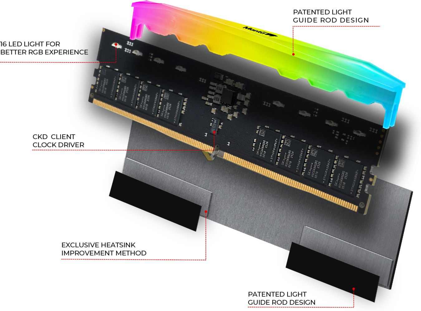 Новый радиатор имеет два кубоида толщиной 0,8 мм, непосредственно интегрированных в пресс-форму. Такая конструкция позволяет радиатору плотно прилегать к чипам памяти, улучшая отвод тепла. Вместо традиционного двустороннего скотча v-color использует высокоэффективную теплоотводящую ленту толщиной 0,2 мм с теплопроводностью 2,5 Вт/мК. При сборке этот патч сжимается до 0,1 мм, что значительно улучшает терморегуляцию.