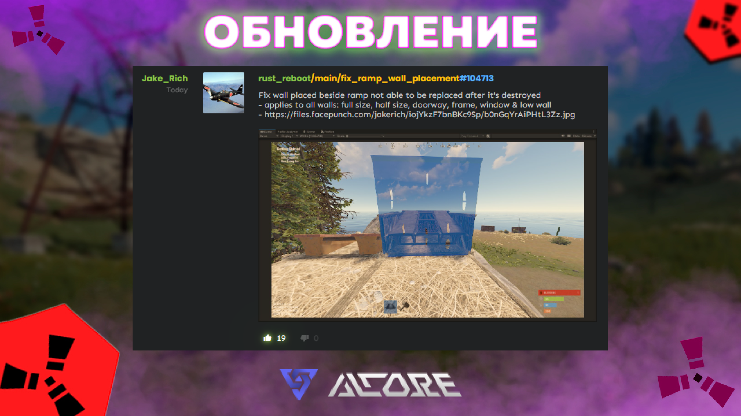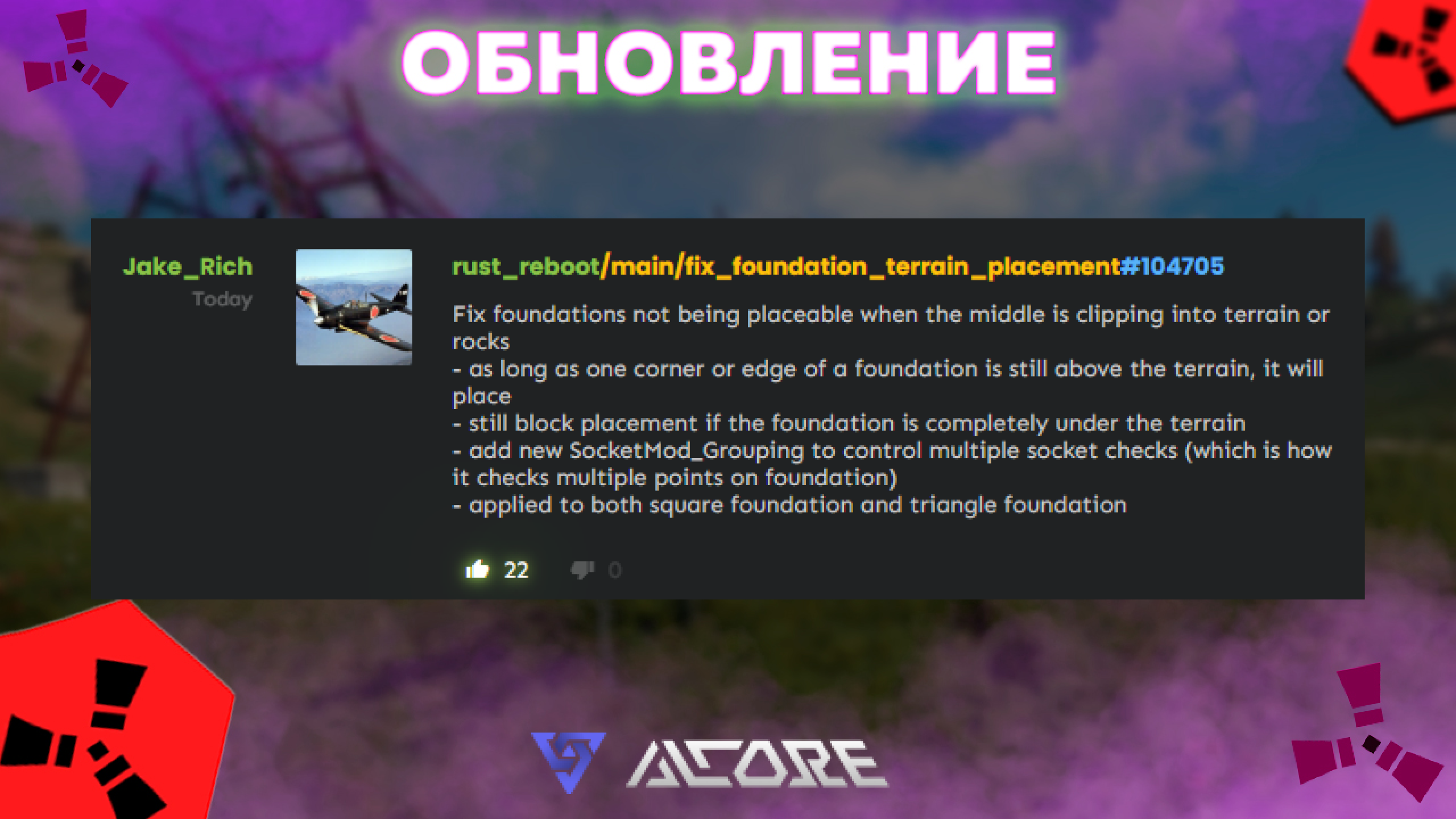 Исправлено что фундаменты невозможно разместить, когда середина врезается в рельеф местности или камни Теперь пока один угол или край фундамента все еще находится над местностью, он будет размещаться Исправили баг со строительством связанный с рампой. Ранее нельзя было поставить стену на то же место как показано на скриншоте после ее разрушения