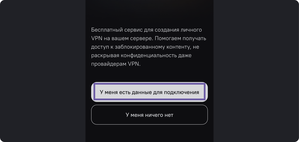 После установки и входа в приложение, вам будет продемонстрирован экран, в котором будут варианты подключения. В нашем случае потребуется выбрать "I have data to connect", как указано на изображении. После чего ввести данные от сервера. Хостинг-провайдеры отправляют вам их на почту после покупки VPS в следующем формате:
