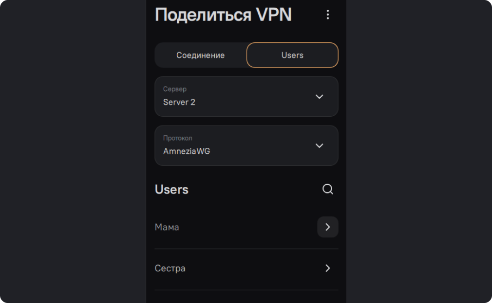 Конечно же не будем забывать про управление нашими подключенными пользователями. Это можно сделать в меню "Пользователи", там вы сможете посмотреть информацию о том, с кем поделились подключением, а также отозвать доступ к своему VPN.