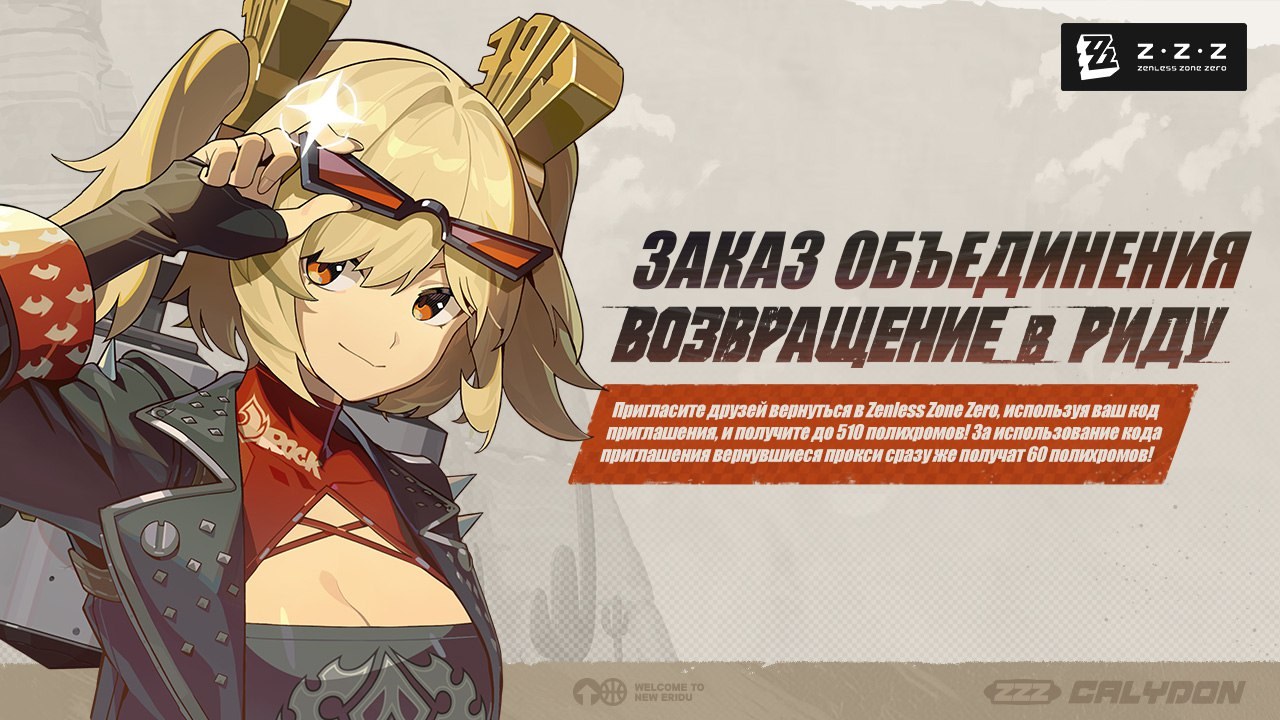 Привет, прокси! Скоро выходит версия Zenless Zone Zero 1.2 «Инферно-кросс»! Пригласите друзей вернуться в Нью-Эриду и принять участие в событии «Снова в деле». За выполнение испытаний «Заказа объединения» можно получить до 540 полихромов!