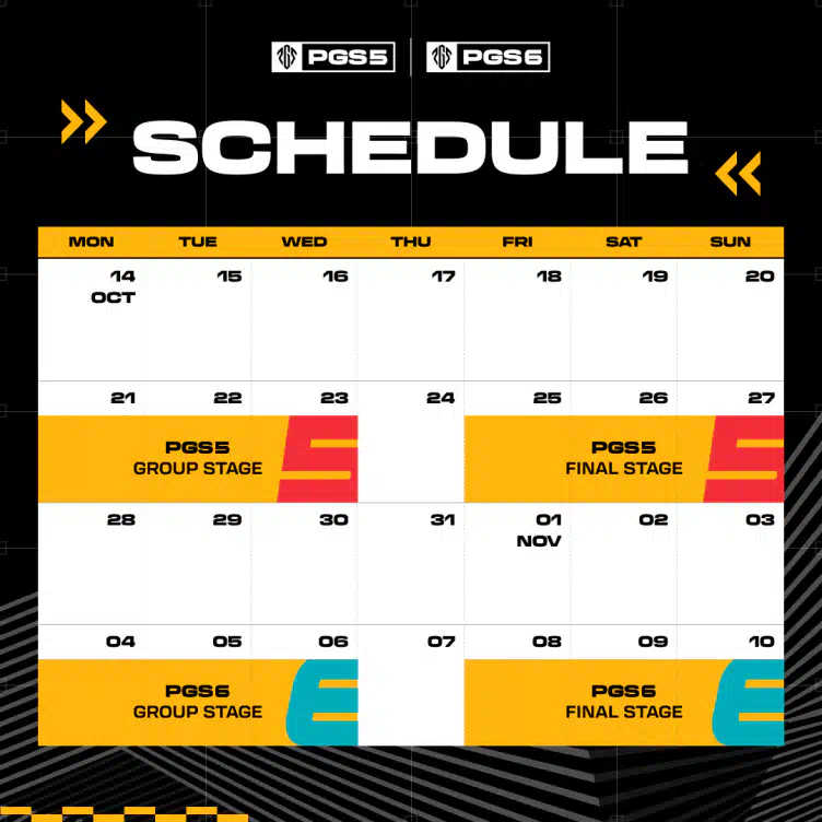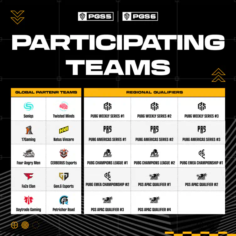10 глобальных партнеров PUBG получат прямые приглашения на PGS 5 & PGS 6. К ним присоединятся 14 победителей региональных первенств, включая двух сильнейших команд PUBG EMEA Championship. Соревнования пройдут в одном формате (групповой этап + гранд-финал).